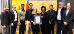 Caption [L-R]: Charles Swart (Associate), Alex Evedemon (Associate), Siphiwe Semelane (Team Manager), Matthew Purdon (Team Manager), Julia du Plessis (Associate Director), Dineo Maboe (Senior Architect), Bob van Bebber (Director), Frits Schuite (Director), Andrew Ellmore (Associate Director).