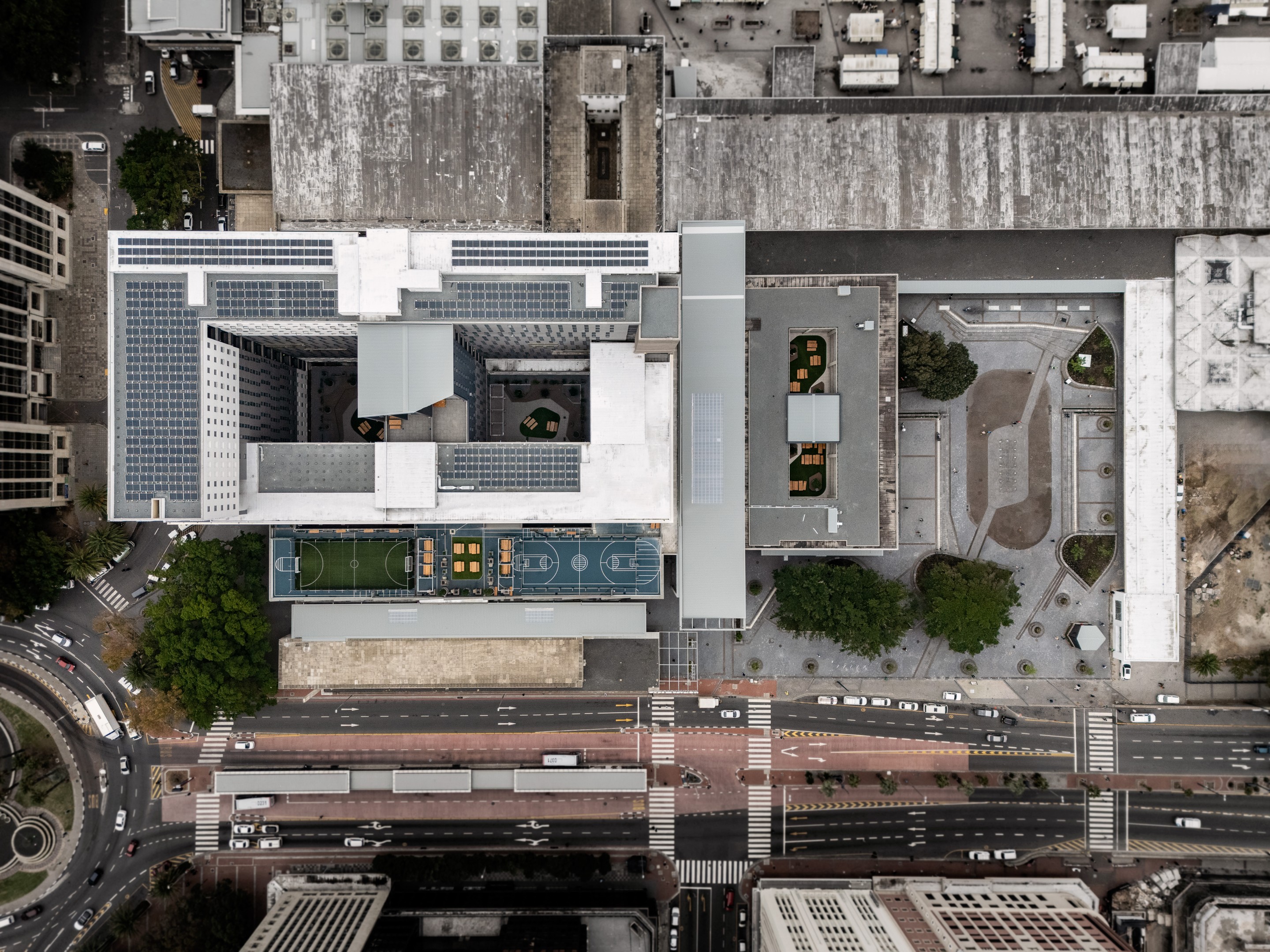 From an urban design perspective, two historical city grids intersect at the station: the historic Dutch city grid, and the modernist layout of the Foreshore. The new building has been designed to moderate this transition. Among its priorities were an imperative to strengthen the street-facing edge along Adderley Street and its response to the surrounding city grid, and to reestablish a green link that runs from Table Mountain through the suburban fabric of the Gardens area and on to the sea, which had become tenuous in the area around the station.