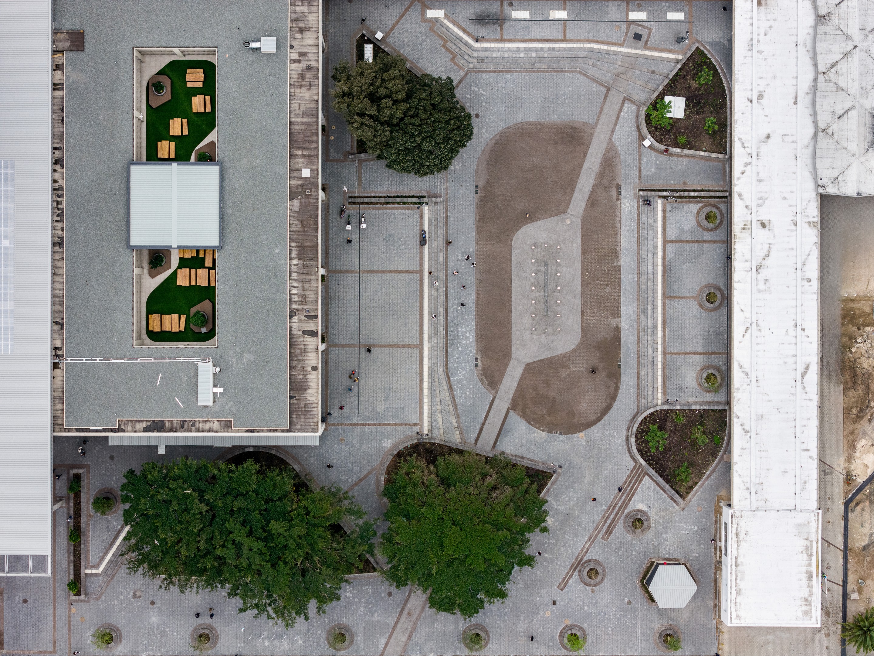 While the shops and square are open to the public ‒ the shops intend to serve the needs of the students who live in the building, as well as commuters and the broader community living and working in the city ‒ the student accommodation is accessed via a lobby on the first floor, subtly distinguishing public and private realms, and supporting access control and the security of the residential units. Two of the rooftop levels (level four and 14) feature roof gardens with sports facilities and breakout spaces. Large, loose planters with trees and shrubbery echo the green spaces in the square.