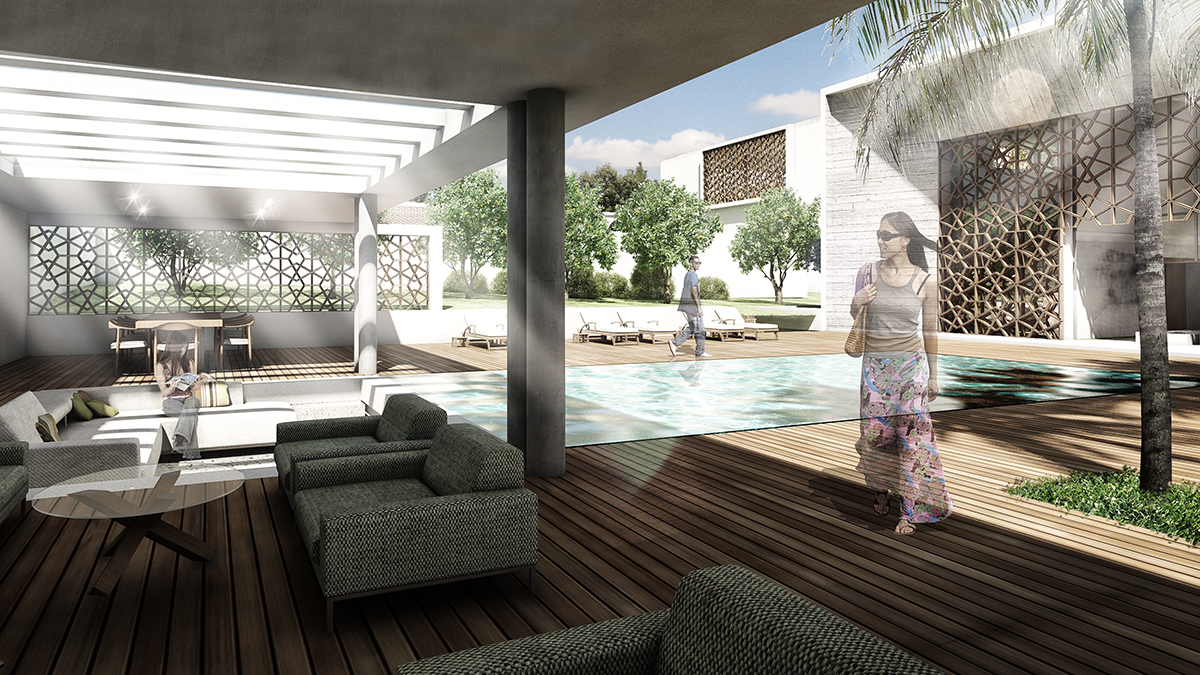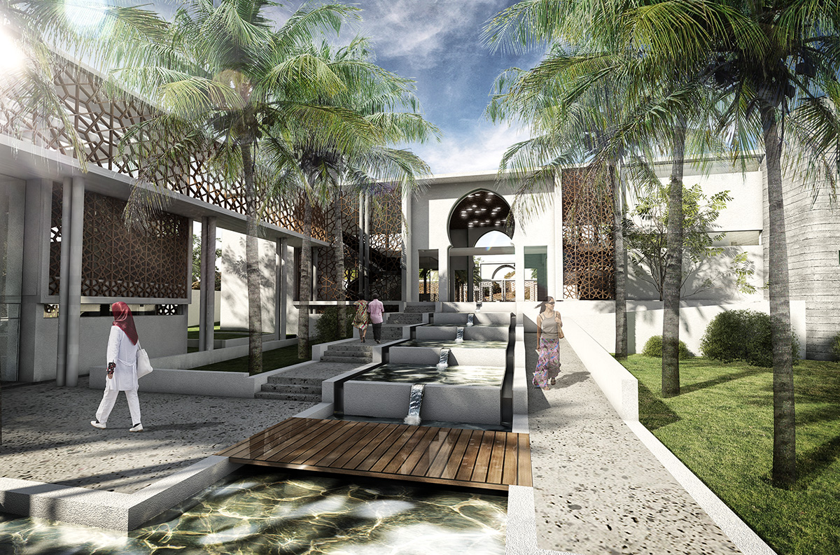 The contemporary interpretation of traditional Algerian architectural features includes; • the use of natural materials such as concrete and timber to emulate historic mud structures and temples • the illusion of thick, solid walls as found in desert architecture is created on the south and west façades by means of slanted concrete walls • small windows which are a characteristic of North African desert architecture are incorporated into the solid wall masses. • lightweight screens that draw inspiration from historic cultural patterns • open courtyards are defined and enclosed by screens to create rich and textured sheltered spaces including water features and cultivated gardens.